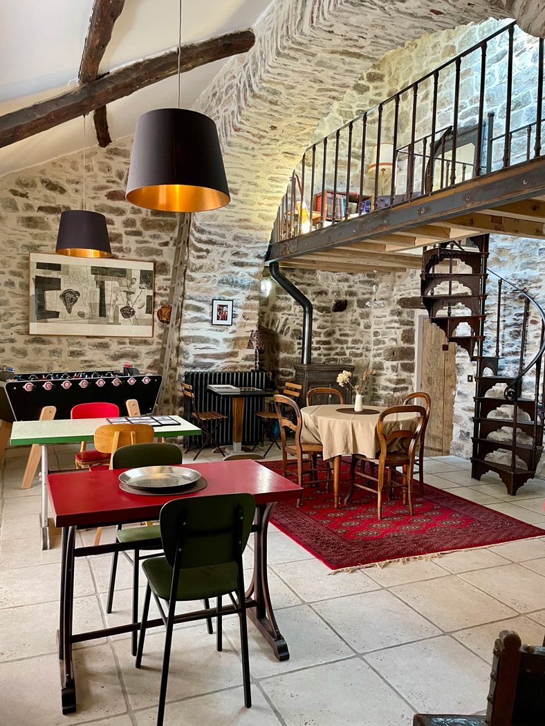 The dining room is a large very high vaulted room which serves breakfast outside the summer season or during rare inclement summer weather.