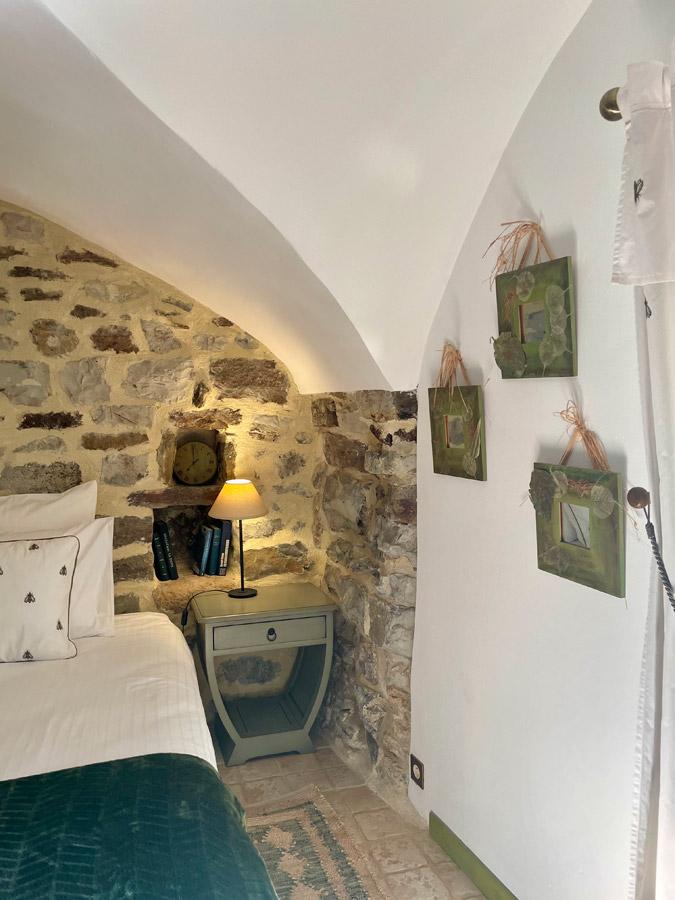Gewelfde kamer met directe toegang tot de steeg beneden, romantisch ingericht, uitgerust met een bed van 180 × 200 cm scheidbaar in 2 bedden, een grote inloopdouche in travertijn.